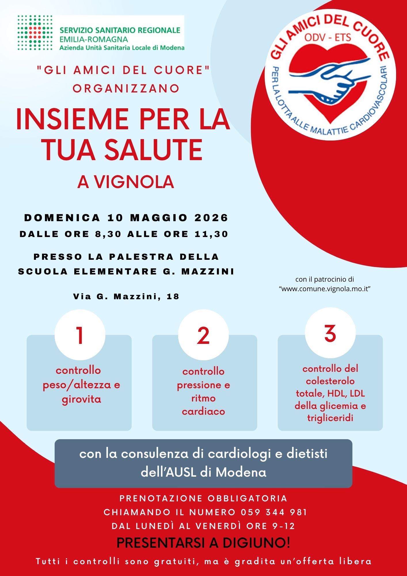 Nuovo appuntamento per Insieme per la tua salute. Domenica 10 maggio ci troverete a Vignola; affrettatevi a prenotare il vostri controlli gratuiti, per prevenire insieme il rischio cardiovascolare.